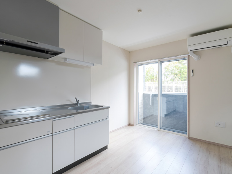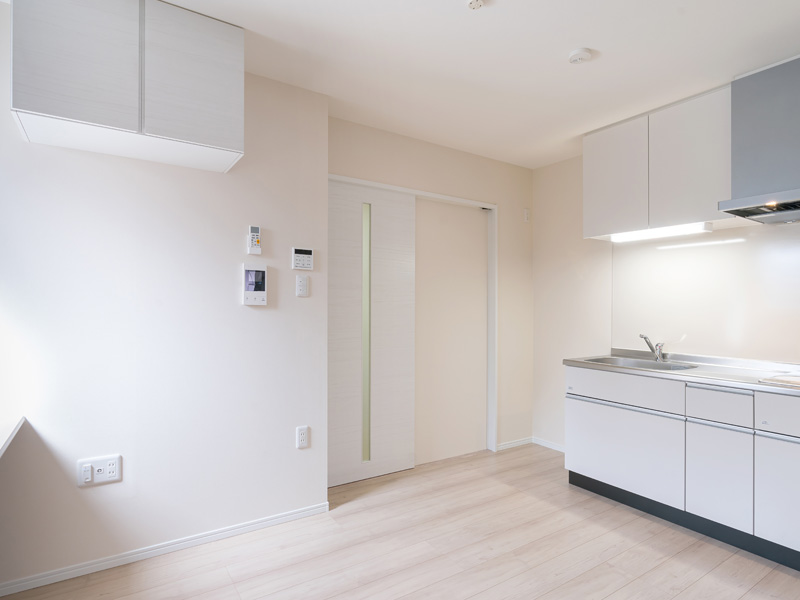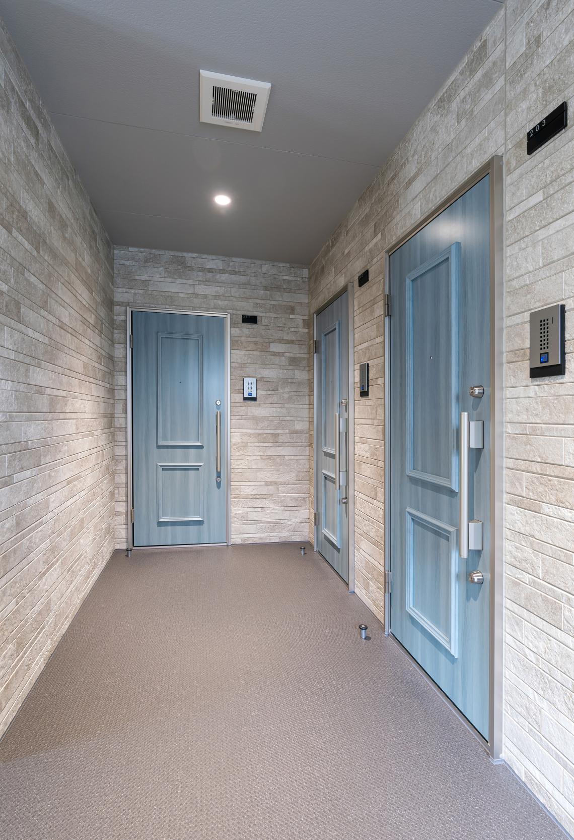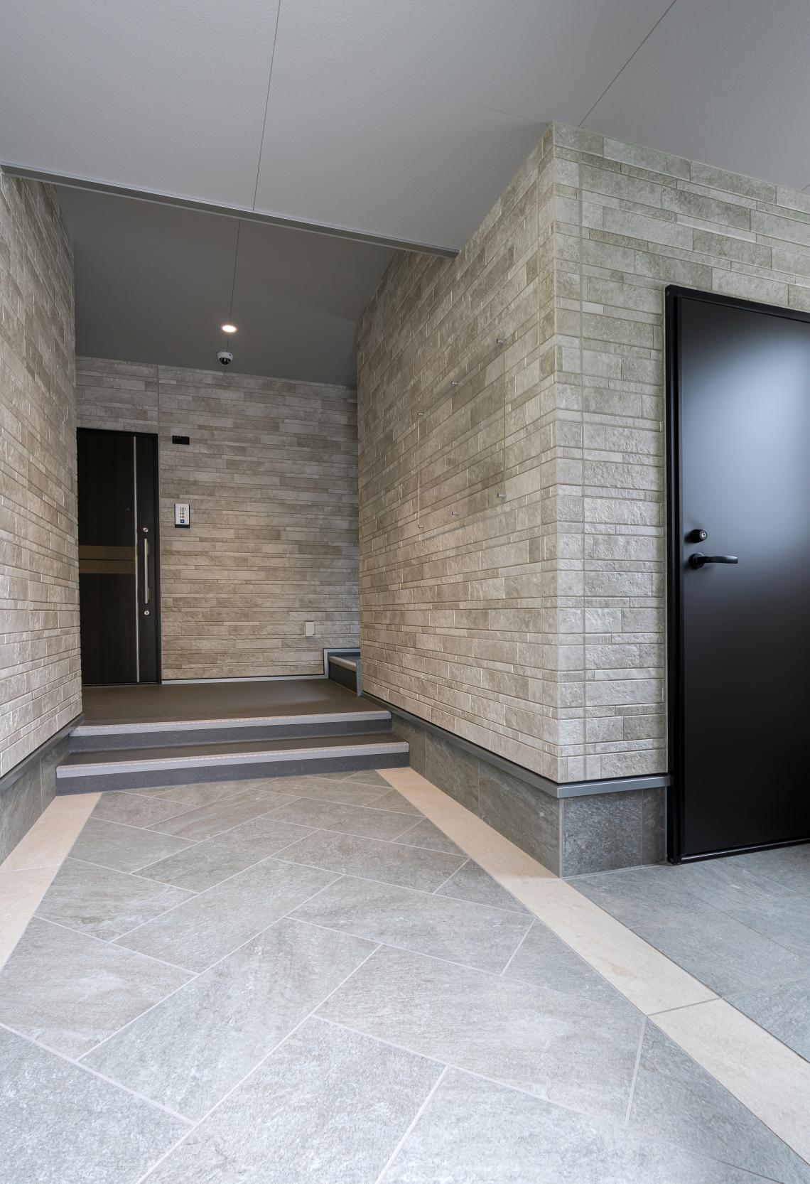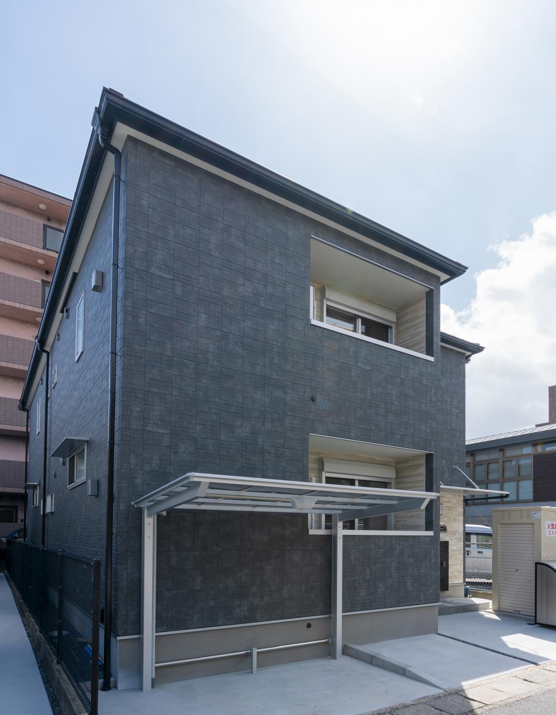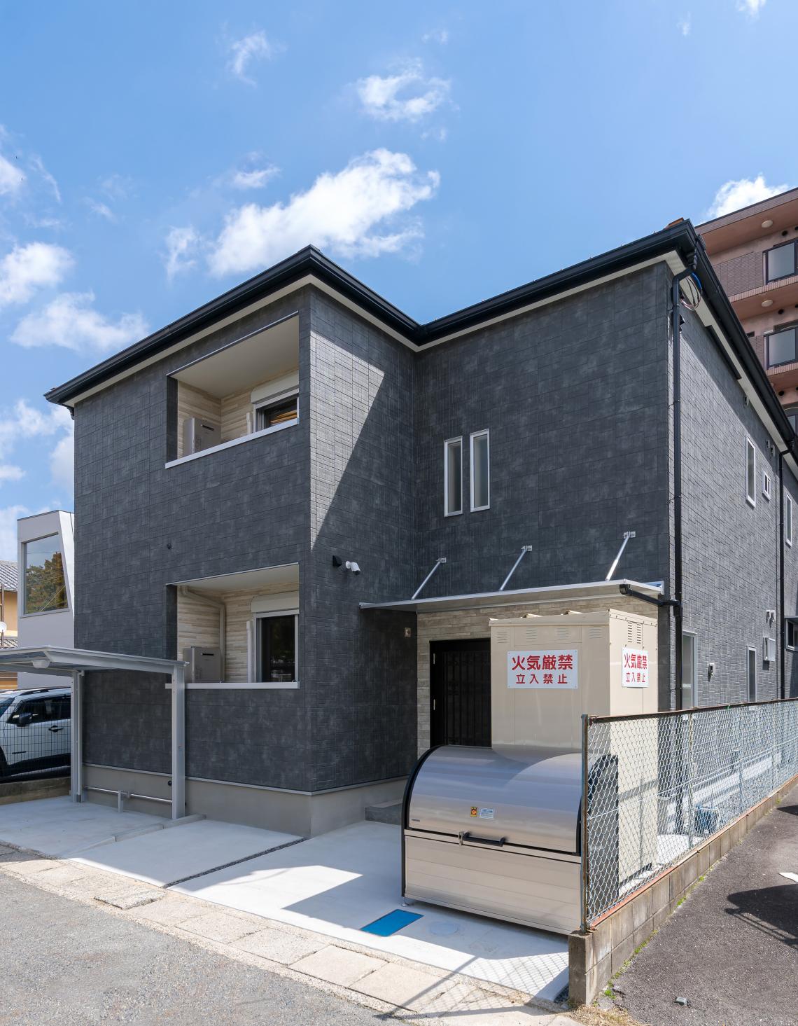 JR野洲駅から徒歩4分のところに位置する木造アパートです。外壁は黒色を基調に白色をアクセントとし、落ち着いた印象の建物です。エントランスドアは装飾的な格子が設けられており、入居者と訪問者を温かく迎えるエントランス空間となっています。
