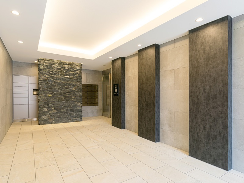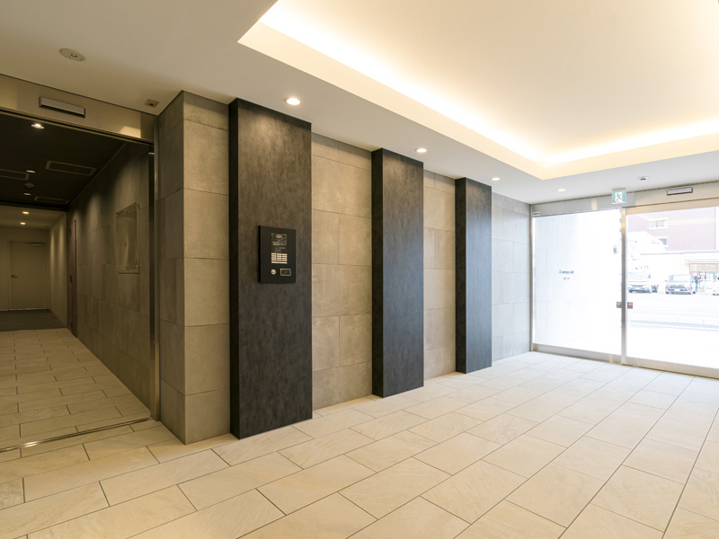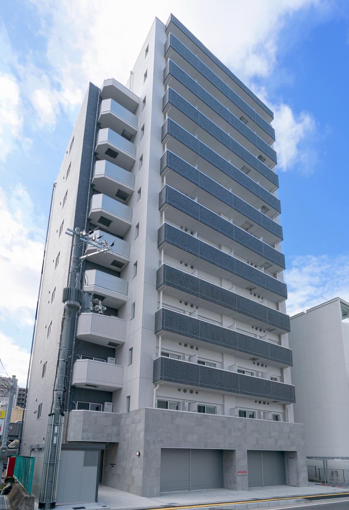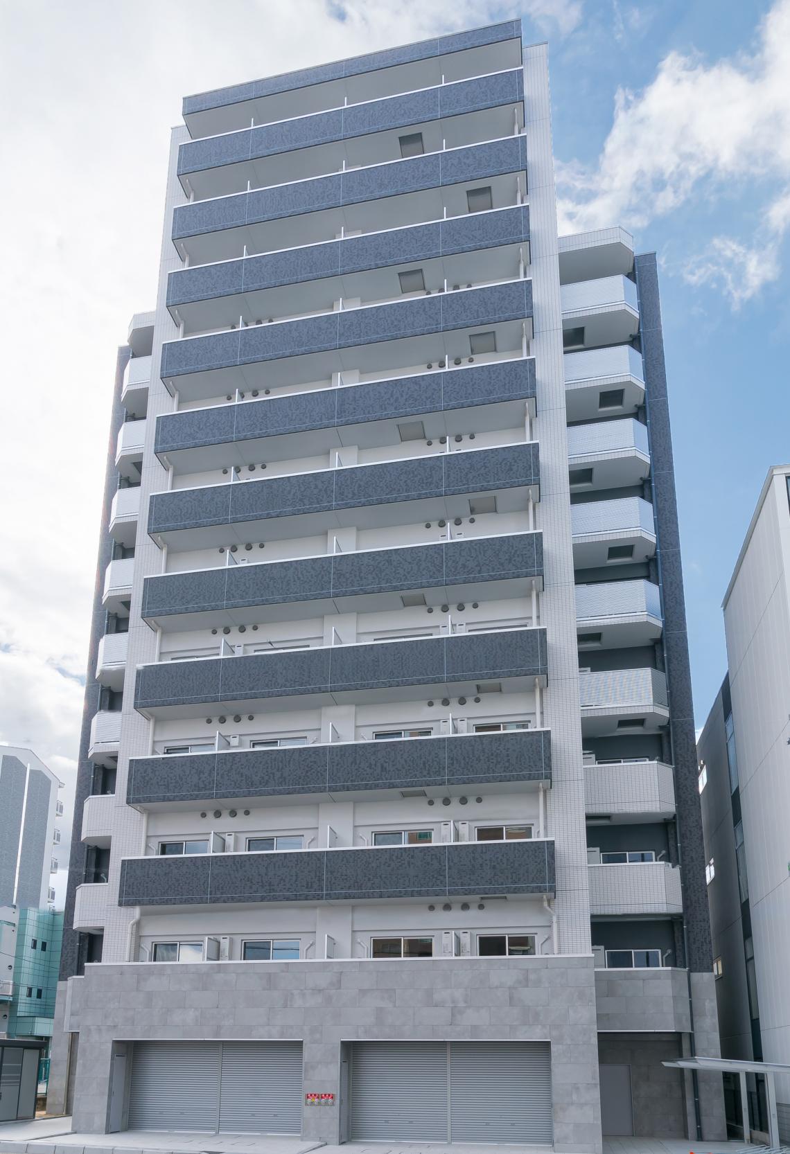 RC造12階建て賃貸マンションで1階はテナント・駐輪スペースとなっており、外観は白と黒とでメリハリある配色です。